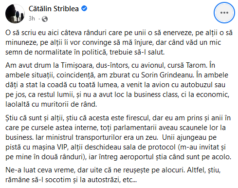 „O să scriu eu aici câteva rânduri care pe unii o să enerveze, pe alții o să minuneze, pe alții îi vor convinge să mă înjure, dar când văd un mic semn de normalitate în politică, trebuie să-l salut. Am avut drum la Timișoara, dus-întors, cu avionul, cursă Tarom. În ambele situații, coincidență, am zburat cu Sorin Grindeanu.