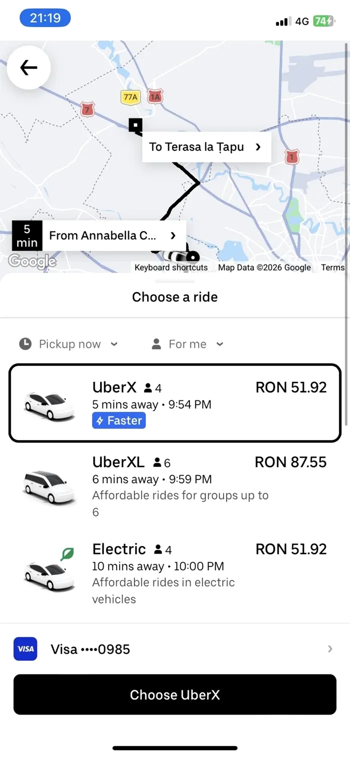 În aplicația Uber, clientului i-a apărut prețul de 51,92 lei pentru cursa de 16 kilometri de la ora 21:54. Pentru varianta UberXL, prețul era de 87,55 lei, iar varianta Electric avea prețul de 51,92 lei, identic cu tariful pentru UberX.