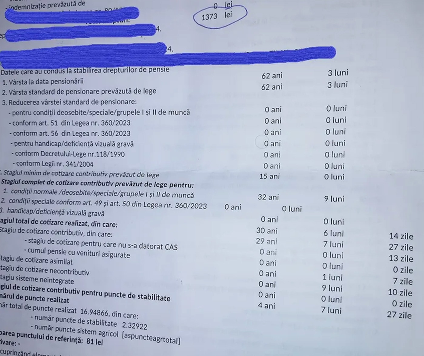 Cele 17 puncte se înmulțesc cu 81 lei (valoarea punctului de referință), pentru a calcula pensia.