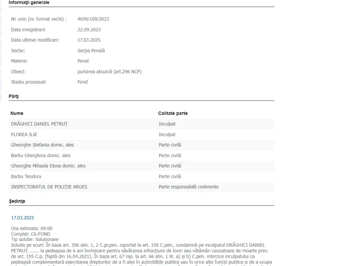 „Condamnă pe inculpatul DRĂGHICI DANIEL PETRUŢ, …… la pedeapsa de 6 ani închisoare pentru săvârşirea infracţiunii de loviri sau vătămări cauzatoare de moarte prev. de art. 195 C.p. (faptă din 16.04.2021) (…) condamnă pe inculpatul DRĂGHICI DANIEL PETRUŢ la pedeapsa de 6 luni închisoare pentru săvârşirea infracţiunii de purtare abuzivă prev. de art. 296 alin. 2 rap. la art. 193 alin.1 C.p. (faptă din 16.04.2021) (…) contopeşte pedepsele aplicate pentru faptele judecate în prezenta cauză, de 6 ani închisoare şi respectiv, 6 luni închisoare, inculpatul DRĂGHICI DANIEL PETRUŢ urmând să execute pedeapsa rezultantă de 6 ani şi 2 luni închisoare (…)