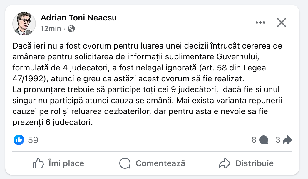 „Doar o scurtă declarație astăzi cu privire la modul în care funcționează Curtea Constituțională, obligatoriu în prezența tuturor celor 9 judecători, dar dacă plenul nu se poate întruni în deplinătatea sa, este necesară prezența a două treimi din numărul judecătorilor.