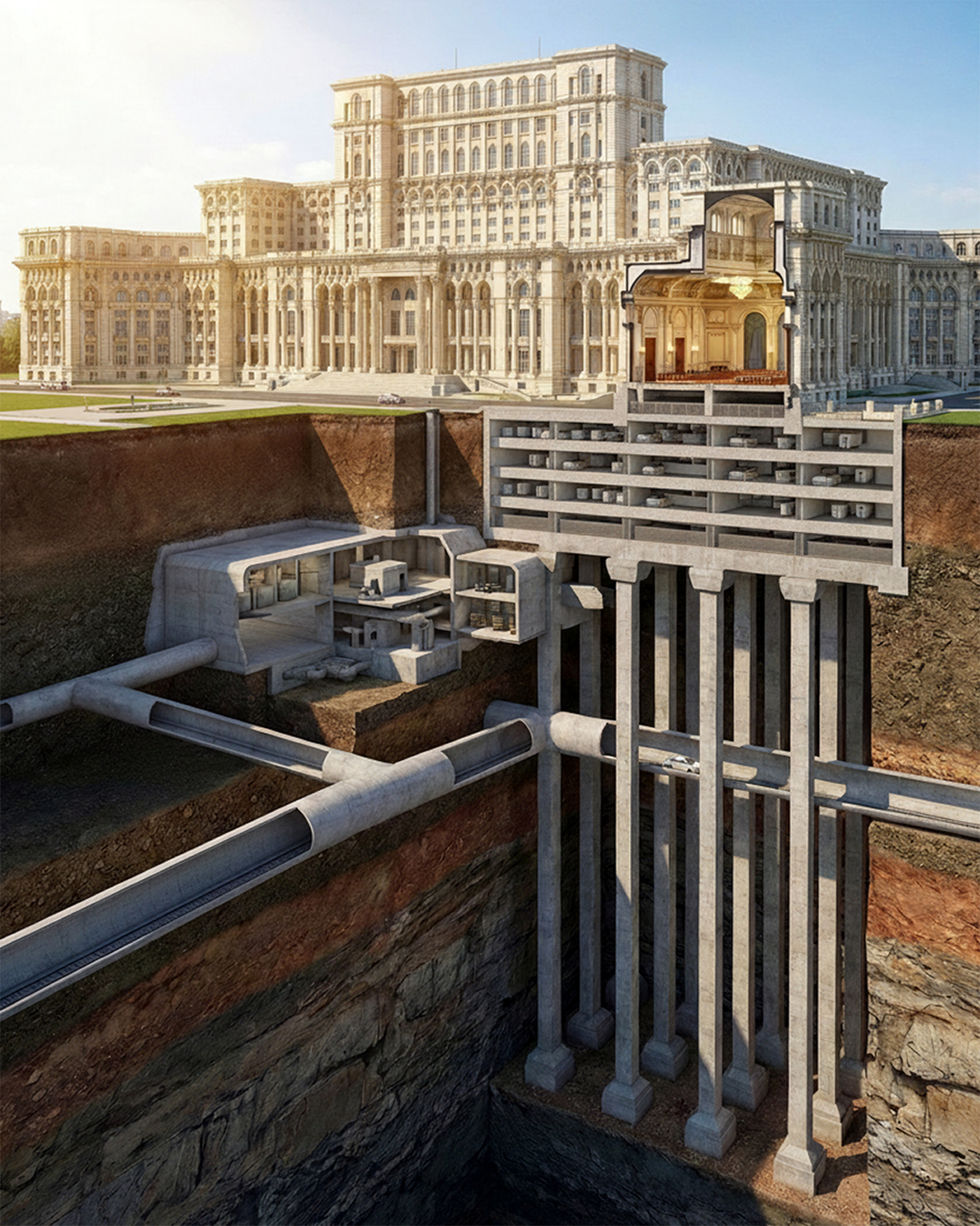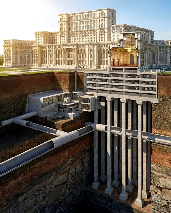Însă arhitecții care au lucrat la acest proiect descriu clădirea ca pe o structură cu o mare adâncime, iar sub picioarele noastre s-ar întinde 92 de metri de structuri subterane. Acolo, ar exista buncăre anti-atomice cu pereți de 1,5 metri grosime, capabile să reziste unui cataclism nuclear, și rețele kilometrice de tuneluri suficient de largi pentru ca mașinile să circule liber, legând Palatul de alte puncte strategice ale orașului, potrivit sursei citate.