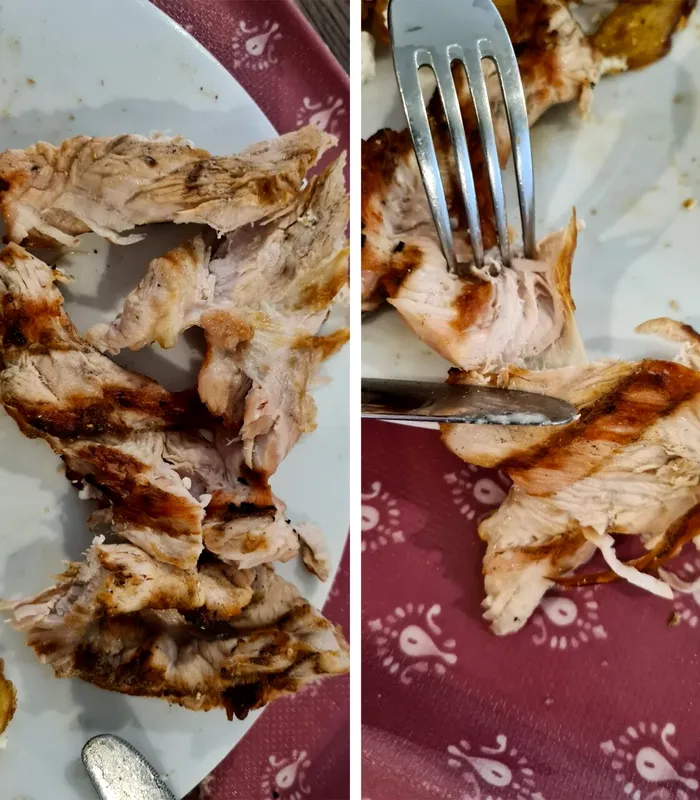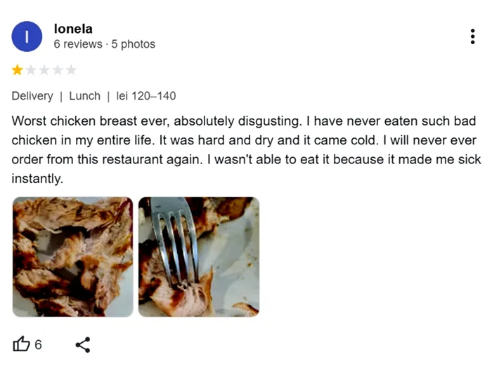 „Cel mai nasol piept de pui, totalmente scârbos. Nu am mâncat carne de pui atât de nasoală în toată viața mea. Era tare și uscat și mi-a fost servit rece. Nu voi mai comanda de la acest restaurant niciodată. Nu am putut să-l mănânc pentru că m-am îmbolnăvit pe loc”, a scris Ionela, făcând publice, totodată, și două fotografii cu pieptul de pui primit.