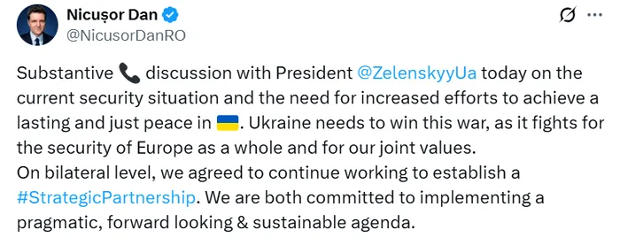 „Ucraina trebuie să câștige acest război, deoarece luptă pentru securitatea Europei în ansamblu și pentru valorile noastre comune”, a declarat Nicușor Dan pe pagina de socializare X.
