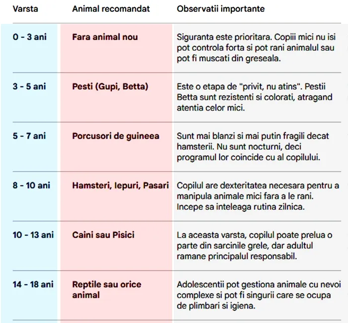 De cele mai multe ori, alegerea unui animal de companie pentru copil este o decizie luată din dorința de a-i face o bucurie. Dar, specialiștii atrag atenția că trebuie ținut cont de vârsta și nivelul de dezvoltare al celui mic.