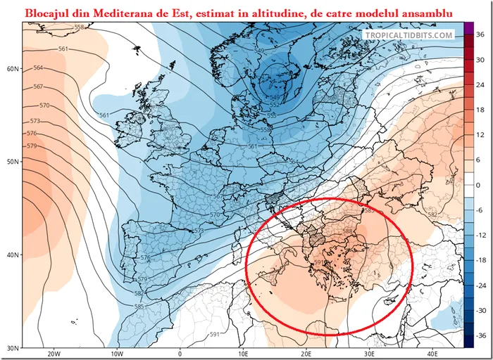 În imaginea 2, putem vedea estimarea centrilor barici din altitudine. Cu toate că anticiclonul prezent la sol depășește cu greu presiunea de 1020 mbari, acesta este extins în altitudine.