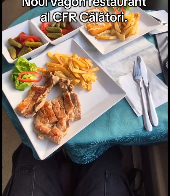 Un român a călătorit într-un vagon restaurant încă de la început de 2026, pe ruta Arad-București. A comandat un piept de pui la grătar cu o porție de cartofi prăjiți și o salată de murături. El a filmat totul și a distribuit clipul pe Tik Tok, iar internauții au reacționat imediat.