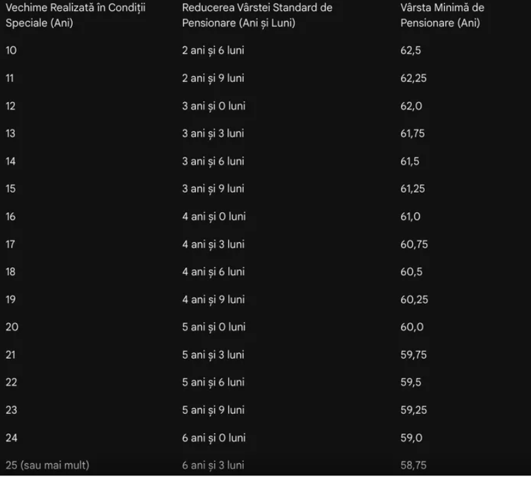 Așa cum reiese din tabel, o vechime de 12 ani în condiții speciale aduce o reducere de 3 ani, permițând pensionarea la 62 de ani. Cei cu 18 ani de vechime se pot pensiona cu 4 ani și 6 luni mai devreme, adică la 60,5 ani.