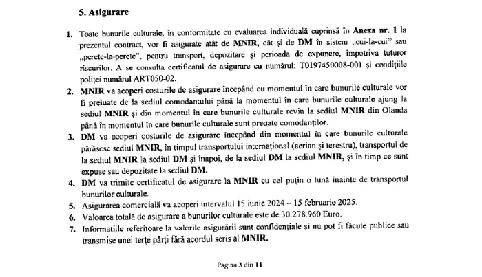 În contract este specificat că: „Valoarea totală de asigurare a bunurilor culturale este de 30.278.960 euro.”