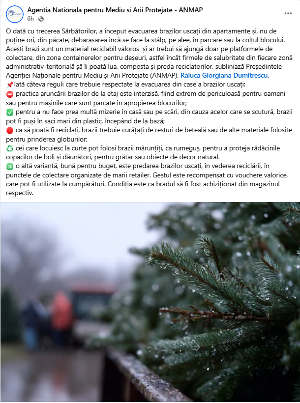 „O dată cu trecerea Sărbătorilor, a început evacuarea brazilor uscați din apartamente și, nu de puține ori, din păcate, debarasarea încă se face la stâlp, pe alee, în parcare sau la colțul blocului. Acești brazi sunt un material reciclabil valoros și ar trebui să ajungă doar pe platformele de colectare, din zona containerelor pentru deșeuri, astfel încât firmele de salubritate din fiecare zonă administrativ-teritorială să îi poată lua, composta și preda reciclatorilor”, a transmis Raluca Georgiana Dumitrescu, președinta ANMAP.