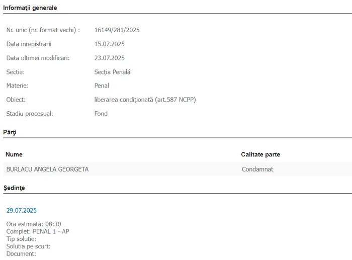 Magistrații au fixat un nou termen pentru a stabili dacă Angela Georgeta Burlacu întrunește toate condițiile pentru a fi eliberată condiționat, iar cererea sa va fi judecată în data de 29 iulie 2025.