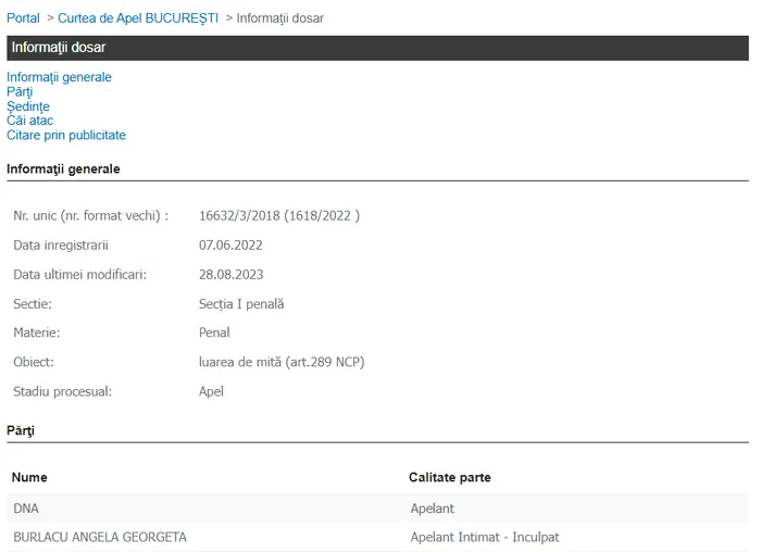 „Desfiinţează, în parte, sentinţa penală apelată şi, rejudecând: Ia act că prin încheierea din 31.01.2023 s-a dispus schimbarea încadrării juridice a faptelor, după cum urmează: (…) BURLACU ANGELA GEORGETA – în infracţiunea de luare de mită (faptă presupus săvârşită în perioada mai 2009 – septembrie 2017 în relaţia cu S.C. Touring Europabus Romania S.R.L.), infracţiunea de trafic de influență (faptă presupus săvârşită în perioada mai 2009 – septembrie 2017 în relaţia cu S.C. Touring Europabus Romania S.R.L.), infracţiunea de trafic de influență (faptă presupus săvârşită în perioada octombrie 2009 – mai 2012 în relaţia cu S.C. Aline Distribution S.R.L.), infracţiunea de efectuare de operaţiuni financiare, ca acte de comerţ, incompatibile cu funcţia, atribuţia sau însărcinarea pe care o îndeplineşte o persoană (faptă presupus săvârşită în perioada iunie 2009 – decembrie 2016)”, au decis magistrații de la Curtea de Apel București.