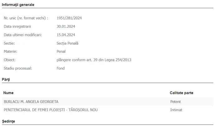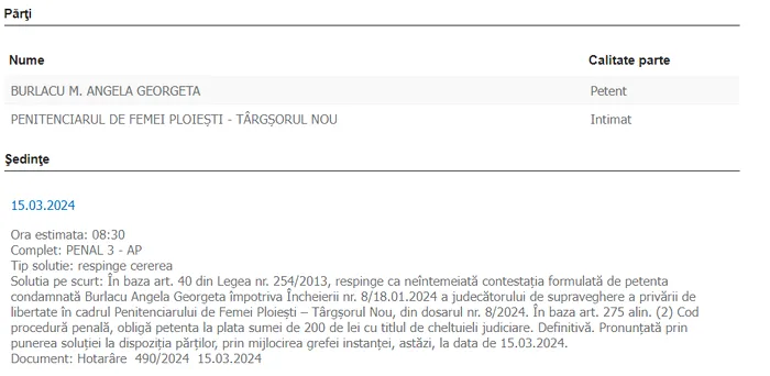 „Tip soluție: respinge cererea. Soluția pe scurt: În baza art. 40 din Legea nr. 254/2013, respinge ca neîntemeiată contestaţia formulată de petenta condamnată Burlacu Angela Georgeta împotriva Încheierii nr. 8/18.01.2024 a judecătorului de supraveghere a privării de libertate în cadrul Penitenciarului de Femei Ploieşti – Târgşorul Nou, din dosarul nr. 8/2024. (…) Obligă petenta la plata sumei de 200 de lei cu titlul de cheltuieli judiciare. Definitivă. Pronunţată prin punerea soluţiei la dispoziţia părţilor, prin mijlocirea grefei instanţei, astăzi, la data de 15.03.2024. Document: Hotarâre 490/2024 – 15.03.2024”, au decis magistrații de la Judecătoria Ploiești.