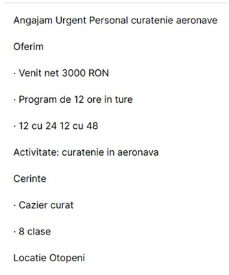 Potrivit anunțului, femeile de serviciu care fac curățenie în avioanele de pe Otopeni (Aeroportul Henri Coandă) lucrează în ture de câte 12 ore, apoi au liber 24, respectiv 48 de ore. De asemenea, e nevoie de cazier judiciar curat. Angajatorul nu precizează dacă mai oferă și alte beneficii, precum asigurarea transportului sau alte servicii.