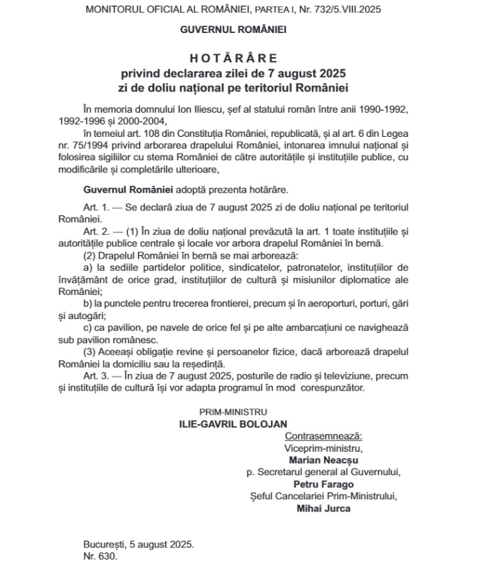 Toate instituțiile și autoritățile publice centrale și locale vor arbora drapelul României în bernă, joi, 7 august, declarată zi de doliu național, arată Hotărârea de Guvern nr. 630 / 2025, adoptată de Executiv și publicată în Monitorul Oficial marți seară.