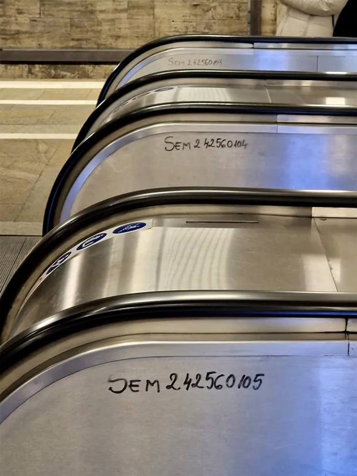 „Dacă tu ai trecut în 2023, Metrorex a trecut în 1973, cu modul ăsta de inventariere a bunurilor companiei. Pe sistem old school, codul de inventar e trecut cu markerul negru, direct pe lateralul metalic al scărilor rulante, chiar sub mâna curentă. Hei, bine că n-au scris cu pensula, cu vopsea.
