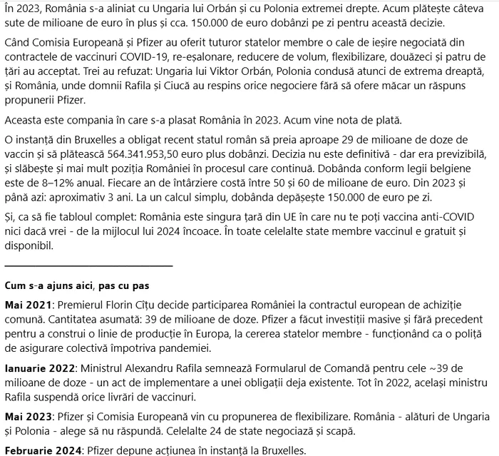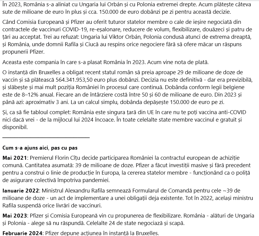 „Aceasta este compania în care s-a plasat România în 2023. Acum vine nota de plată. O instanță din Bruxelles a obligat recent statul român să preia aproape 29 de milioane de doze de vaccin și să plătească 564.341.953,50 euro plus dobânzi. Decizia nu este definitivă – dar era previzibilă, și slăbește și mai mult poziția României în procesul care continuă.