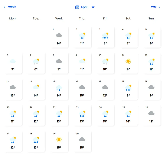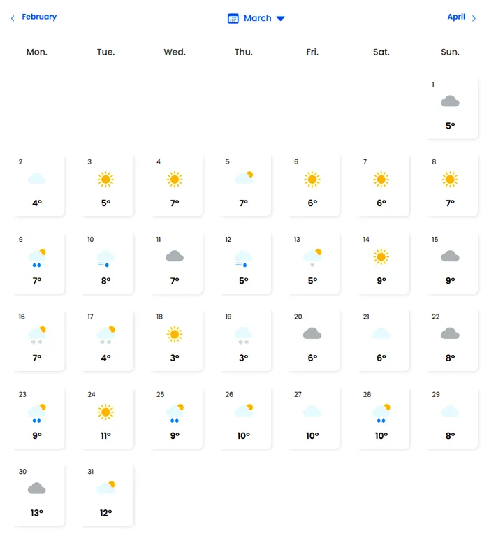 La Brașov, de exemplu, prognoza EaseWeather pentru martie și aprilie 2026, ilustrată și în imaginile de mai jos, arată mai multe zile cu temperaturi scăzute, cer acoperit, precipitații mixte și chiar ninsori.