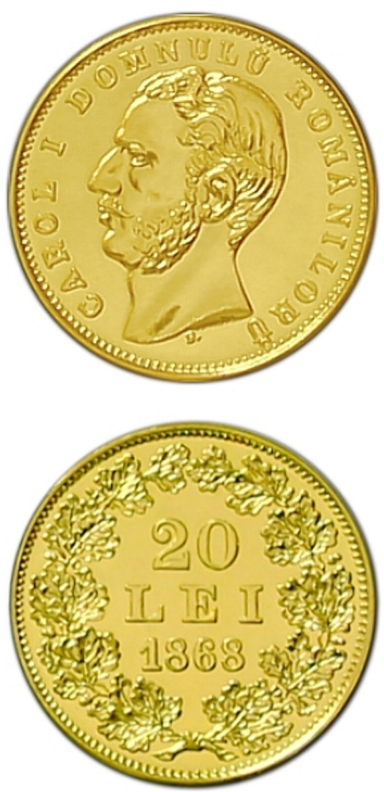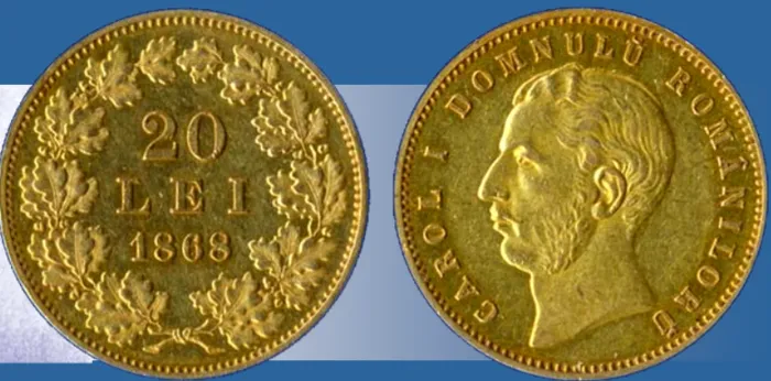 Un an mai târziu, în 1868, au fost fabricate primele monede pe care apare numele monedei româneşti – 100 de piese din aur de 20 lei.