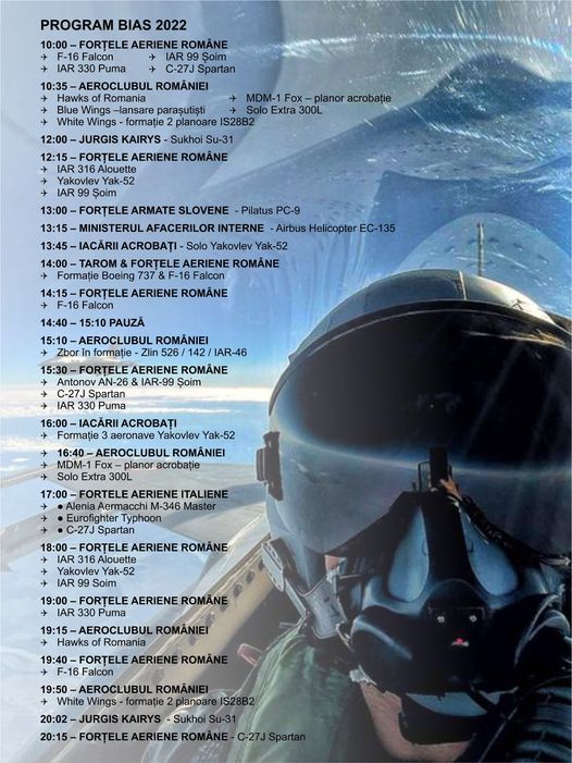 Forţele Aeriene Române se remarcă la BIAS 2022 cu o participare de excepție, care se distinge printr-o serie de evoluții în premieră absolută pentru România. care vor încânta cu adevărate demonstrații artistice de forță supersonică la manşa aeronavelor F-16 Fighting Falcon, IAR 99 Șoim și cu evoluții speciale ale aeronavelor IAR 316 Alouette, IAK 52, IAR 330 PUMA, C 130 Hercules, AN 26 și C 27J Spartan. Spectatorii vor putea urmări, de asemenea, exerciţii specifice de poliţie aeriană şi de sprijin pentru desant aerian.