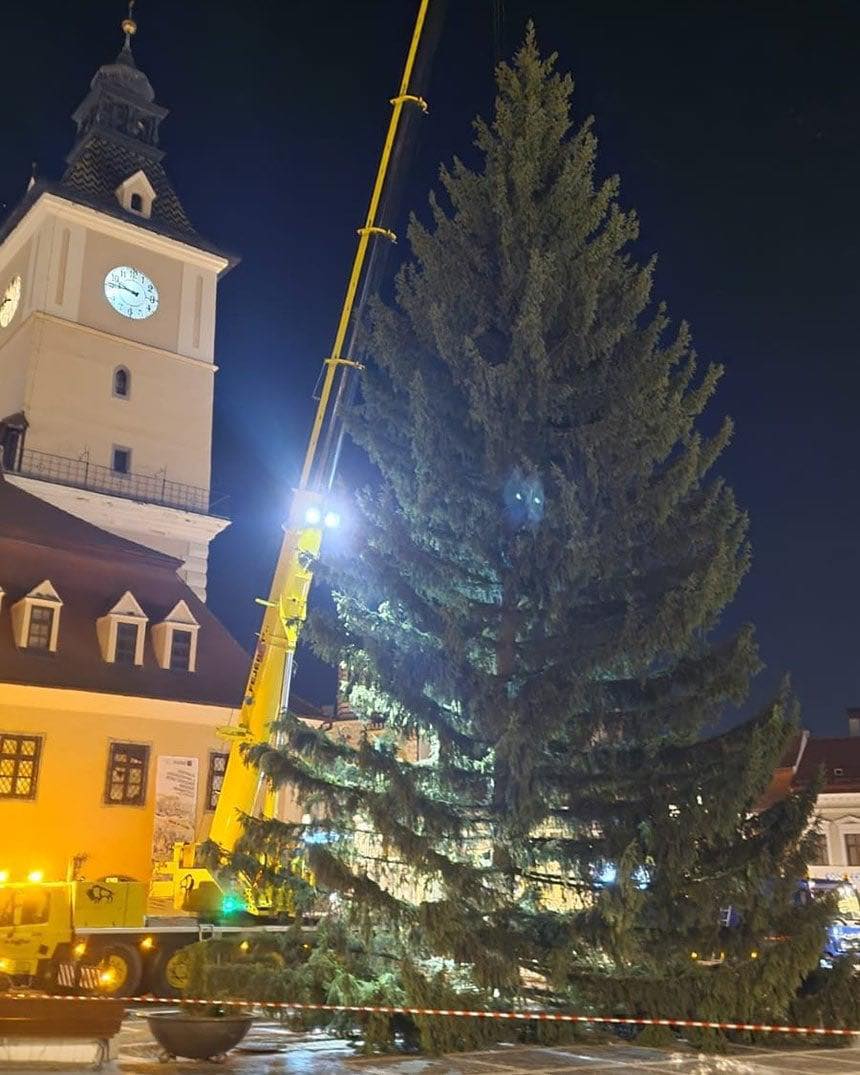 Operațiunea de transportare și montare a bradului natural de Crăciun s-a încheiat foarte târziu în noapte. S-a muncit cot la cot pentru ca pomul să stea în poziție verticală, în centrul istoric al Brașovului. De altfel, zona a fost îngrădită temporar, pentru ca această operațiune să se desfășoare în condiții de siguranță. Pomul, care are vârsta de 76 de ani, urmează să fie împodobit.