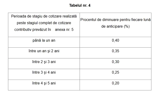 „Cuantumul pensiei anticipată se stabileşte din cuantumul pensiei pentru limită de vârstă, prin diminuarea acestuia în raport cu stagiul de cotizare realizat peste stagiul complet de cotizare contributiv şi cu numărul de luni cu care s-a redus vârsta standard de pensionare, conform tabelului nr. 4”, arată CNPP.