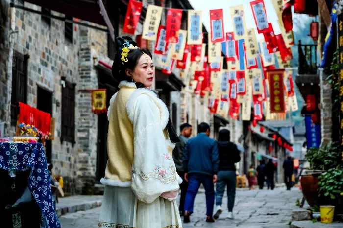 CHINA, HUBEI PROVINCE – DECEMBER 4, 2025: A woman in traditional Chinese clothes in Ming-and-Qing Cobblestone Street in Yang Lou Dong (Credit Image: © Yuri Smityuk/TASS via ZUMA Press)