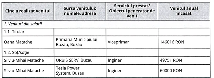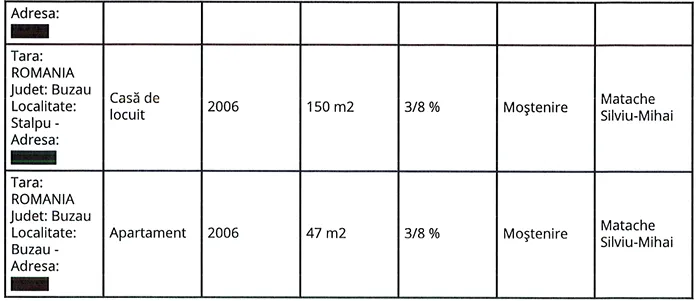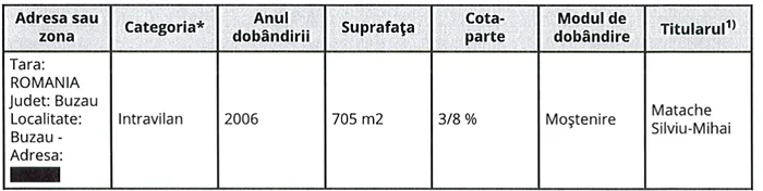 Oana Matache deține, împreună cu soțul său, un apartament de 134 de metri pătrați în municipiul Buzău, cumpărat în anul 2021, cu o cotă de 1/2 fiecare. În declarație apar mai multe proprietăți moștenite, toate în județul Buzău. Este vorba despre un teren intravilan de 705 metri pătrați, o casă de locuit de 150 de metri pătrați și un apartament de 47 de metri pătrați, toate dobândite în anul 2006.