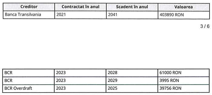 Deputata PSD are și credite bancare. Cel mai mare este un credit contractat în 2021 la Banca Transilvania, cu scadență în 2041, în valoare de aproximativ 403.890 de lei. În documente mai apare și un credit la BCR, de 61.000 de lei, scadent în 2028.