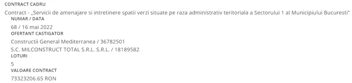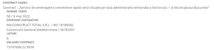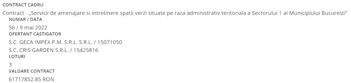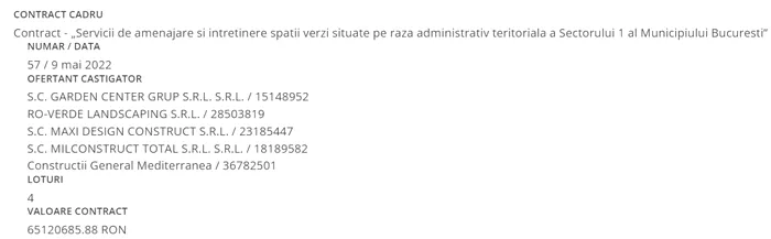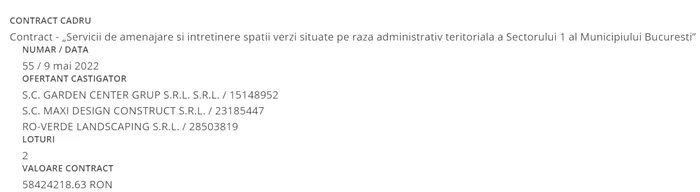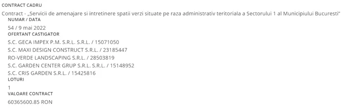 Loturile din Contractul cadru „Servicii de amenajare și întreținere spații verzi situate pe raza administrativ teritorială a Sectorului 1 al Municipiului București” au fost atribuite în iulie 2022 astfel: