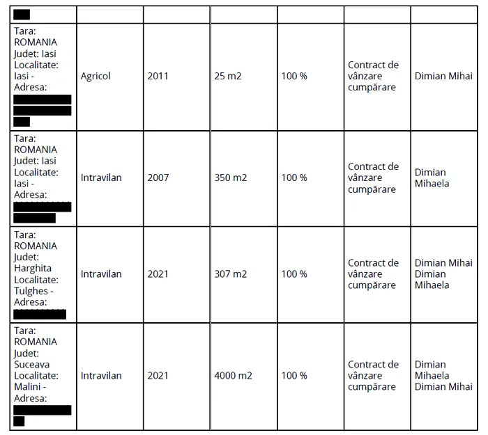 La capitolul autovehicule, Dimian a declarat două autoturisme marca Mercedes, ambele obținute prin contracte de vânzare-cumpărare.