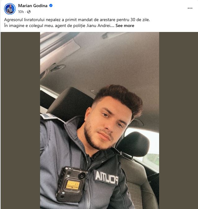 „Agresorul livratorului nepalez a primit mandat de arestare pentru 30 de zile. În imagine e colegul meu, agent de poliție Jianu Andrei. Felicitări, Andrei!”, este mesajul notat de Marian Godină, pe Facebook.