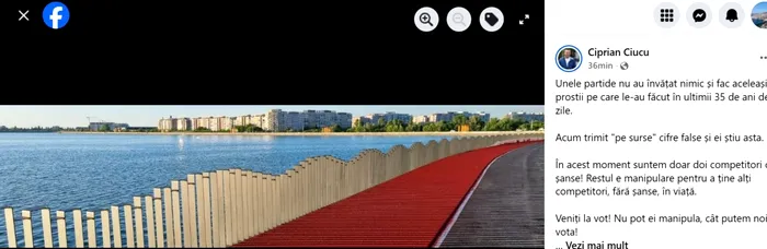 „Unele partide nu au învățat nimic și fac aceleași prostii pe care le-au făcut în ultimii 35 de ani de zile. Acum trimit „pe surse” cifre false și ei știu asta. În acest moment suntem doar doi competitori cu șanse! Restul e manipulare pentru a ține alți competitori, fără șanse, în viață. Veniți la vot! Nu pot ei manipula, cât putem noi vota!”, este mesajul postat de primarul Sectorului 6.