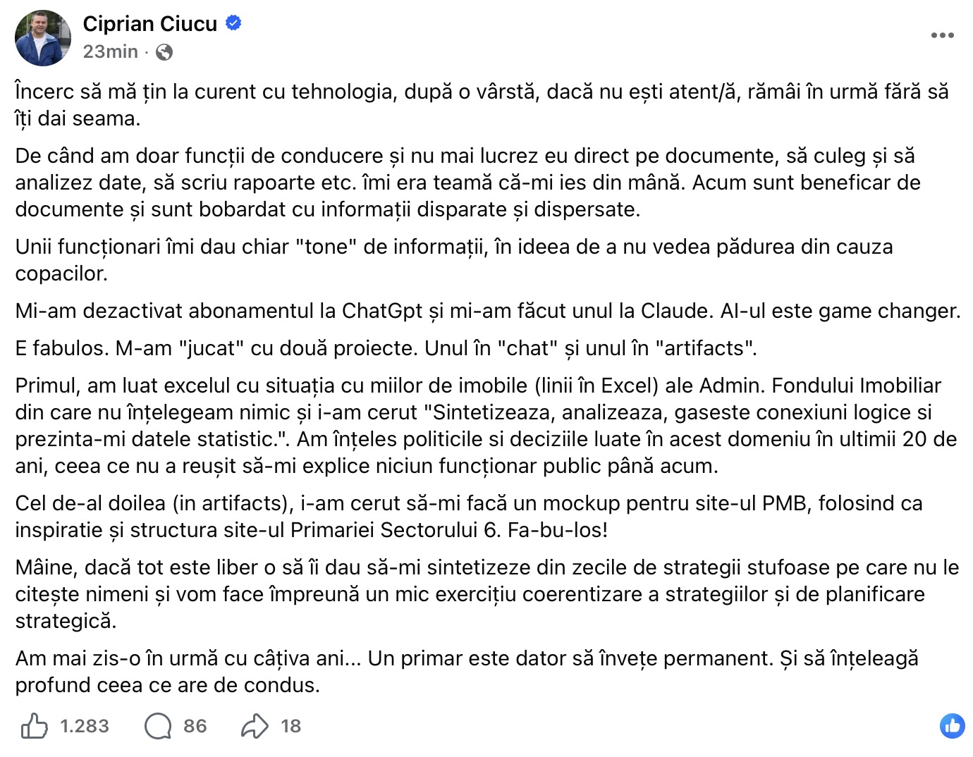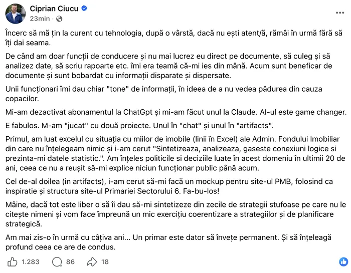 Ciprian Ciucu a povestit într-o postare pe Facebook cum a experimentat recent utilizarea inteligenței artificiale în activitatea de la primărie. Acesta susține că a folosit două tipuri de aplicații AI pentru a analiza date și pentru a crea concepte digitale, concluzionând că tehnologia poate deveni un instrument esențial pentru administrația publică.