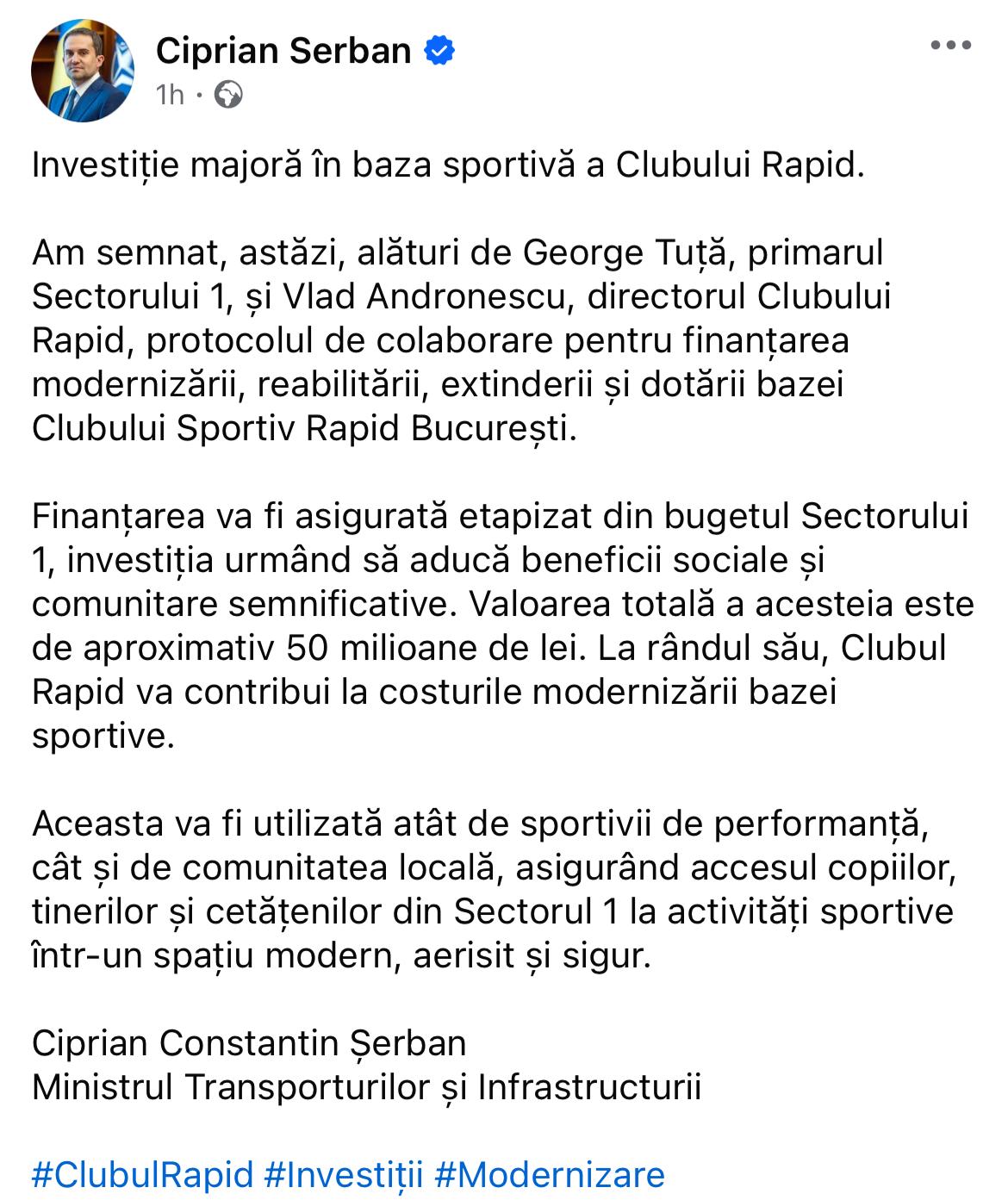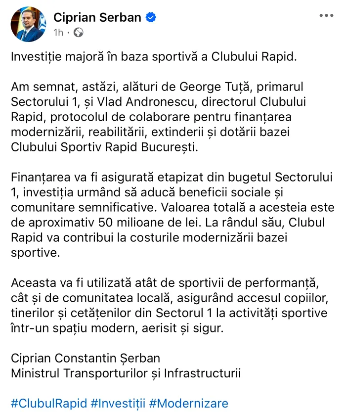 Prin intermediul unei postări pe pagina sa de Facebook, Ciprian Șerban, ministrul Transporturilor, a anunțat o investiție majoră în baza sportivă a Clubului Rapid.