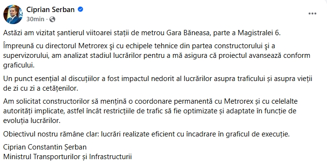 Printr-o postare pe pagina sa de Facebook, Ciprian Șerban, ministrul Transporturilor, a anunțat că a vizitat șantierul viitoarei stații de metrou Gara Băneasa, parte a Magistralei 6.