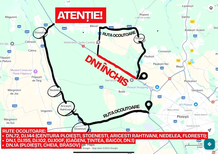 Circulația va fi închisă temporar pe DN1, între Ploiești și Florești, iar șoferii pot accesa rutele ocolitoare. Traficul este deviat începând cu ziua de luni, 24 noiembrie 2025, anunță Consiliul Județean Prahova și Poliția Română. Zona indicată pe hartă, mai jos, va fi închisă circulației până pe 27 noiembrie 2025 (joi), ora 12:00.
