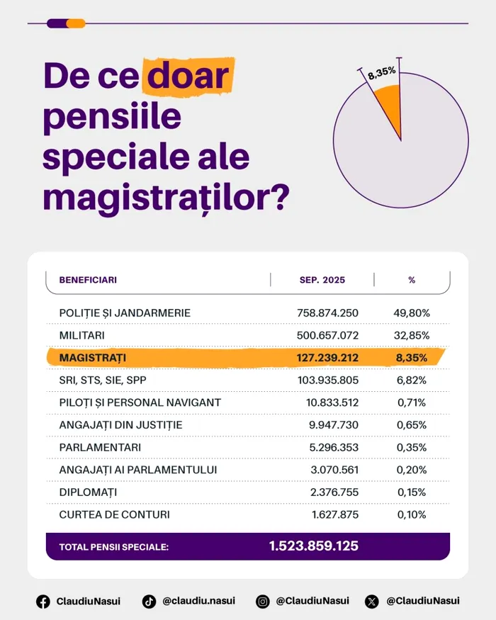 Năsui mai scrie că statul cheltuieşte doar „8%” cu pensiile magistraţilor şi rămâne pesimist când vine vorba de reuşita unui demers politic care să ducă la eliminarea acestora.