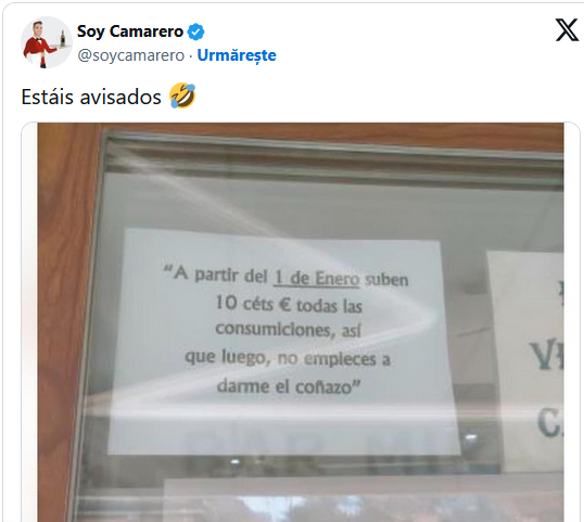 „De la 1 ianuarie, toate băuturile se scumpesc cu 10 cenți, așa că după aceea să nu începeți să vă plângeți, să mă deranjați mai târziu”, se arată pe afișul pus de patronul localului, ca avertisment pentru clienții săi fideli, scrie ediția spaniolă a publicației Huffington Post.
