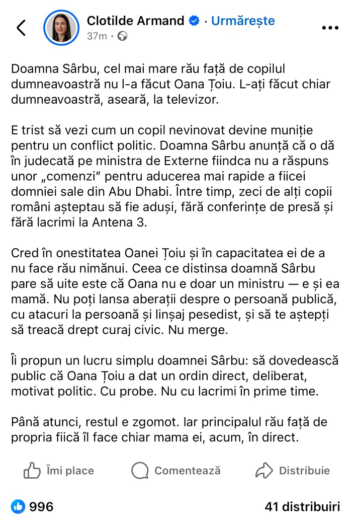„Cred în onestitatea Oanei Țoiu și în capacitatea ei de a nu face rău nimănui. Ceea ce distinsa doamnă Sârbu pare să uite este că Oana nu e doar un ministru — e și ea mamă. Nu poți lansa aberații despre o persoană publică, cu atacuri la persoană și linșaj pesedist, și să te aștepți să treacă drept curaj civic. Nu merge.”