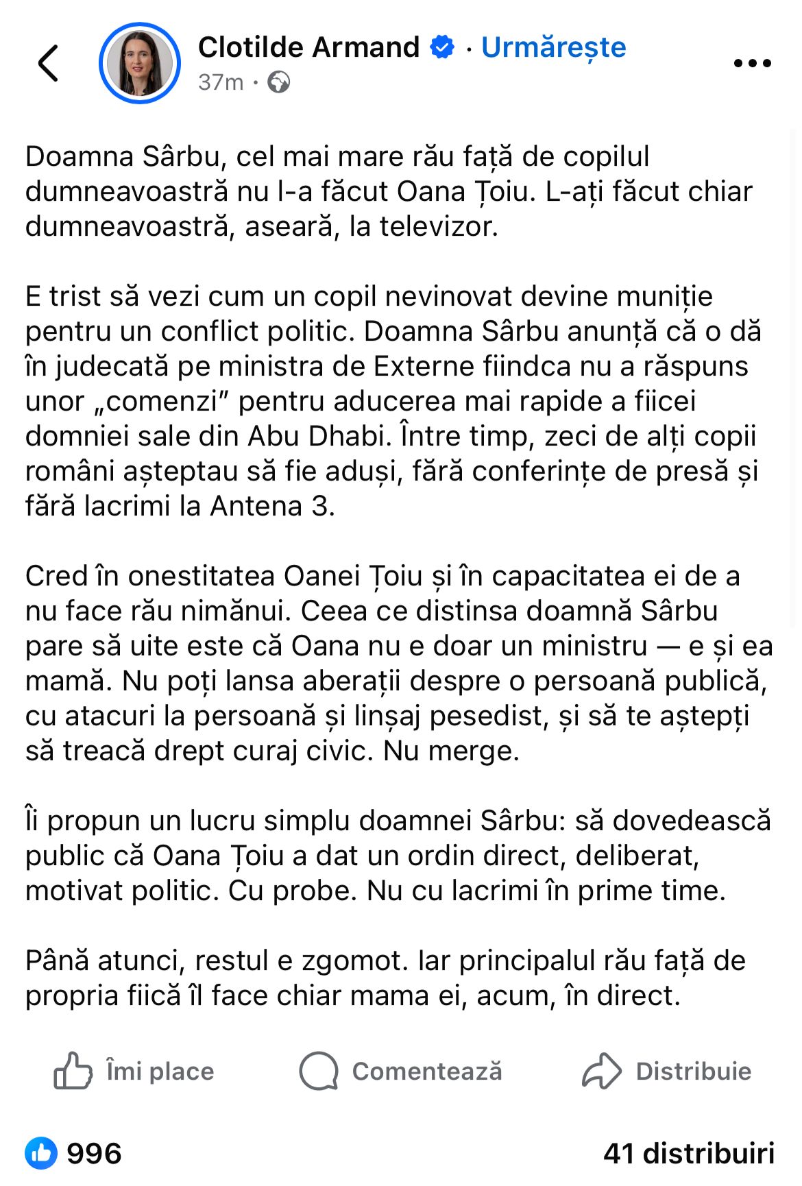 Clotilde Armand a avut o primă reacție publică în scandalul izbucnit după ce fiica minoră a fostului premier Victor Ponta nu ar fi fost lăsată să se îmbarce în autocarul care transporta un grup de minori din Dubai spre Oman, de unde aceștia urmau să zboare către România. Armand o acuză direct pe Daciana Sârbu că își expune copilul într-un conflict politic și îi cere să aducă dovezi împotriva ministrului de Externe, Oana Țoiu.