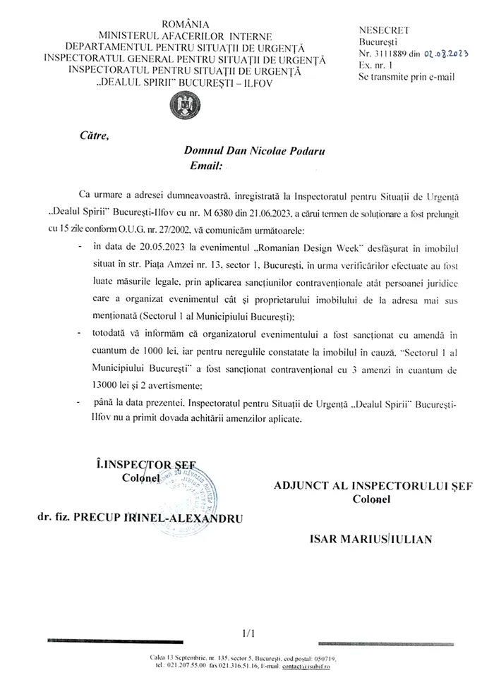„Pe data de 29 mai, am publicat documentul ISU, prin care mi se comunica faptul că în cadrul evenimentului Romanian Design Week au fost constatate nereguli și s-a constatat că evenimentul (RDW 2023) se desfășura într-un imobil neautorizat din punct de vedere al securității la incendiu. Pentru aceste abateri, au fost acordate amenzi contravenționale (găsiți postarea în link-ul de mai jos)