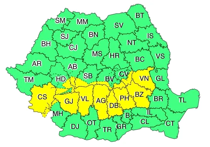 Meteorologii au emis o avertizare cod galben de ninsori abundente, vânt puternic şi viscol, în Carpaţii Meridionali şi de Curbură pentru 14 județe din centrul și sud-vestul țării, valabilă de miercuri de la ora 17.00 până vineri, 11 decembrie, la ora 15.