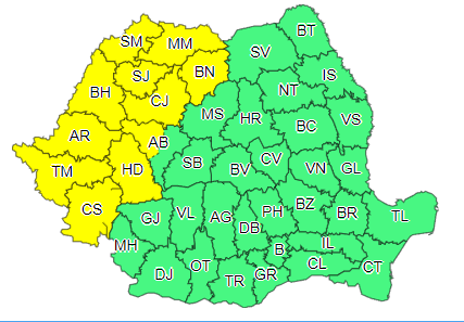 Administrația Națională de Meteorologie a emis un cod galben de ploi torențiale și furtuni în mai multe județe din vestul și nordul țării.