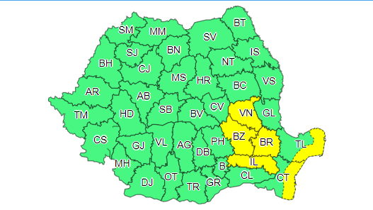 Totodată, meteorologii au emis un cod galben de vijelii în mai multe zone din România.
