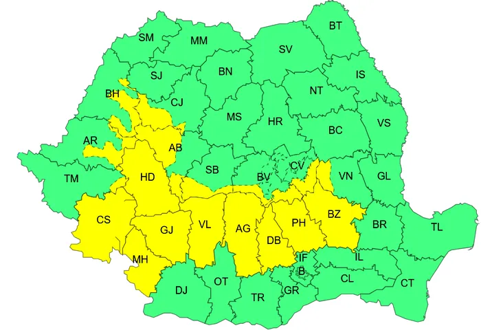 Tot joi, între orele 10.00 și 20.00, în județele Timiș și Caraș-Severin este valabil un Cod galben de vânt puternic. Aici, rafalele vor atinge 50-70 km/h, iar în Munții Banatului și în zonele montane înalte ale Carpaților Meridionali, vântul va bate cu viteze de până la 100 km/h, viscolind zăpada, potrivit site-ului ANM.