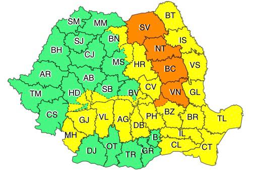 Astfel, potrivit meteorologilor, codul portocaliu de vremea rea va afecta județele Suceava, Neamț, Bacău, Vrancea şi zona de munte a judeţului Buzău, unde va ploua abundent și se vor acumula cantități de apă de 40…50 l/mp și izolat 60…70 l/mp. Ploi local abundente vor fi şi în Dobrogea, precum și în celelalte judeţe din Moldova şi din estul şi nord-estul Munteniei.