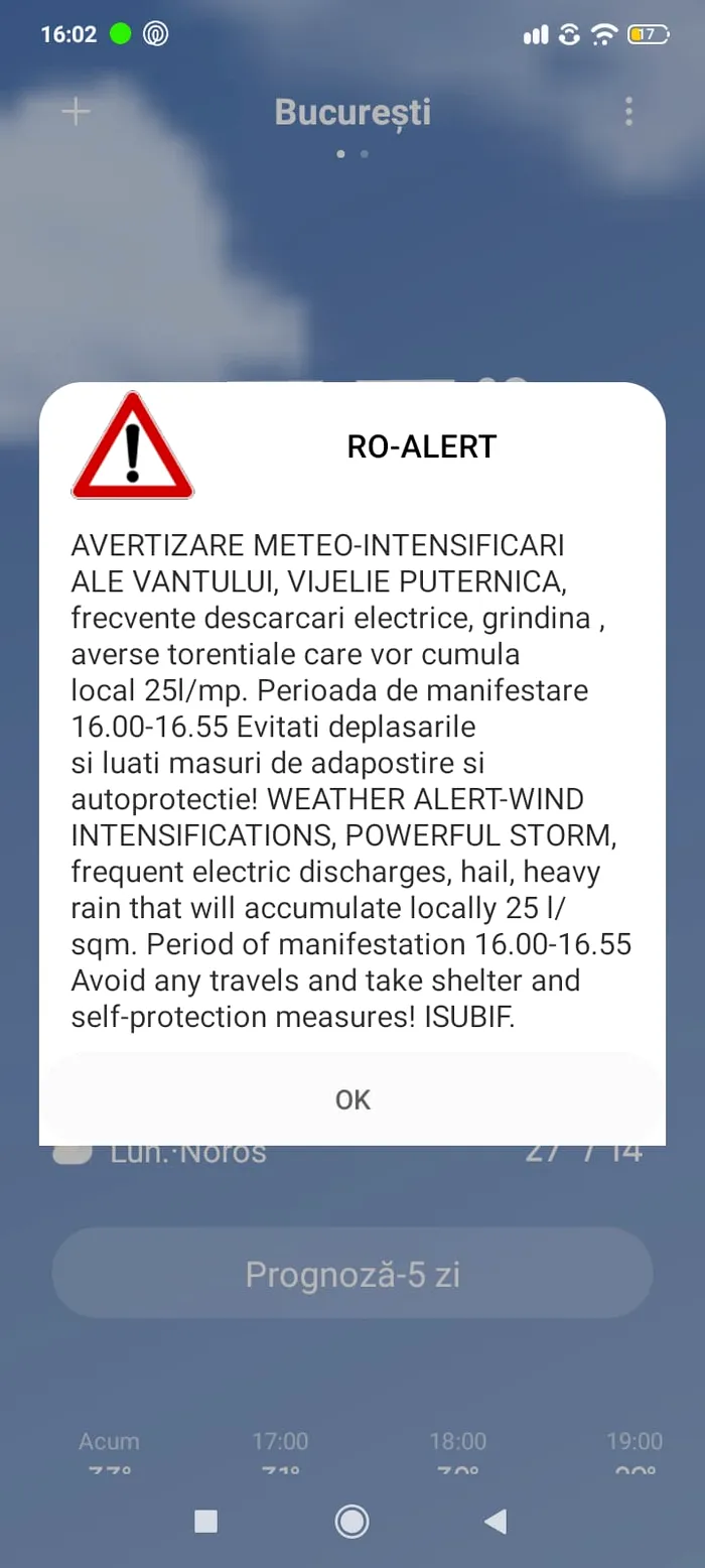 În acest context, Inspectoratul pentru Situații de Urgență (ISU) a emis un mesaj RO-Alert pentru avertizarea populației.