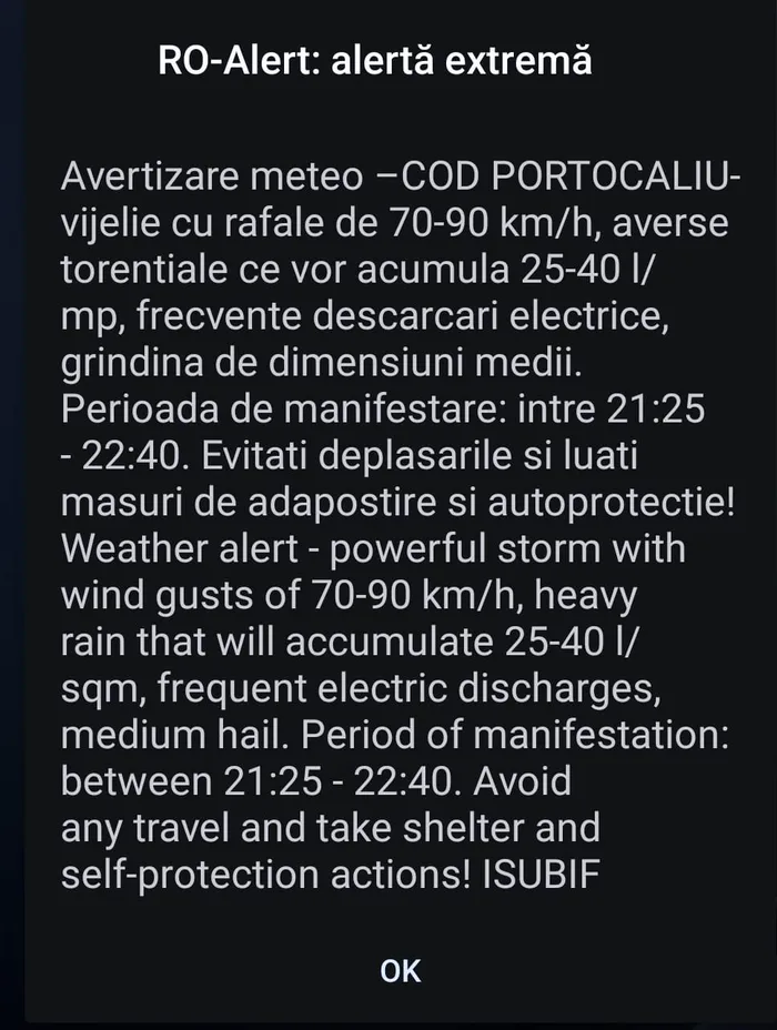 „Avertizare meteo -COD PORTOCALIU- vijelie cu rafale de 70-90 km/h, averse torentiale ce vor acumula 25-40 1/ mp, frecvente descarcari electrice, grindina de dimensiuni medii. Perioada de manifestare: intre 21:25 – 22:40. Evitati deplasarile si luati masuri de adapostire si autoprotectie! „