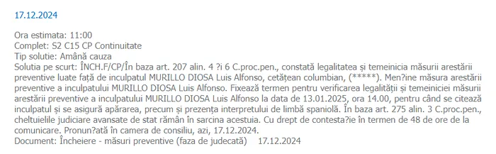 Fixează termen pentru verificarea legalităţii şi temeiniciei măsurii arestării preventive a inculpatului MURILLO DIOSA Luis Alfonso la data de 13.01.2025, ora 14.00, pentru când se citează inculpatul şi se asigură apărarea, precum şi prezenţa interpretului de limbă spaniolă.